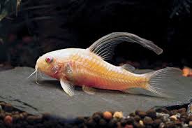 The Highfin Albino Corydoras (Corydoras aeneus 'Highfin') is a selectively bred variation of the popular Bronze Corydoras. It is a peaceful, active, bottom-dwelling catfish known for its pale, pinkish-white body, red eyes, and a gracefully elongated dorsal fin. They are highly social and an excellent addition to most community aquariums.
